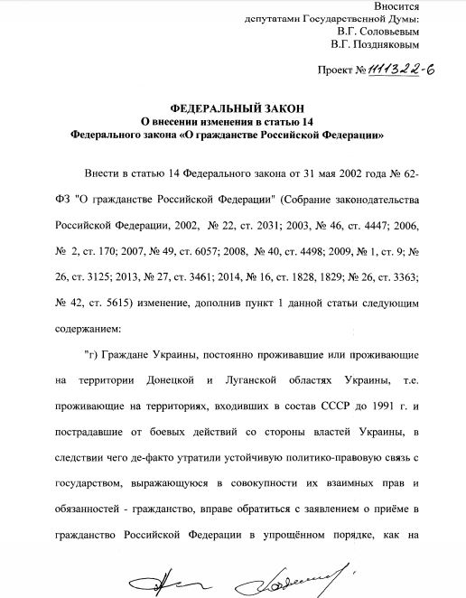 Судя по всему – дату внесения законопроекта коммунисты приурочили к празднованию Дня Конституции Украины. По мнение депутатов от КПРФ эти лица перестали быть гражданами Украины так как: «…утратили устойчивую политико-правовую связь с государством, выражающуюся в совокупности их взаимных прав и обязанностей – гражданстве». При этом власти Украины обвинены в нарушении Конституции Украины от 1996 года и боевых действиях.