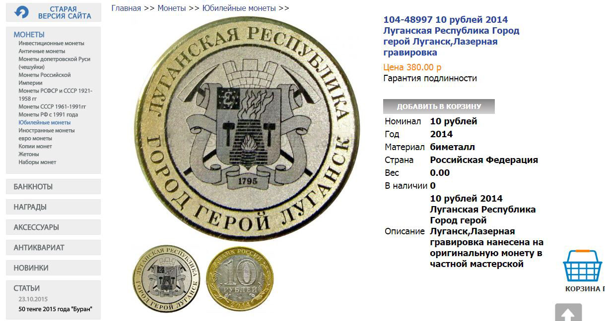 Речь идет о российских монетах достоинством в 10 рублей чеканки 2014 года. Локация продавцов достаточно обширная – Екатеринбург, Орел, Новодвинск и другие российские города. Монеты предлагаются в продаже по цене от 200 до 380 рублей. Происхождение монет неизвестно - в самих лотах информация не указана, а на вопросы через личные сообщения сайтов продавцы не отвечают.