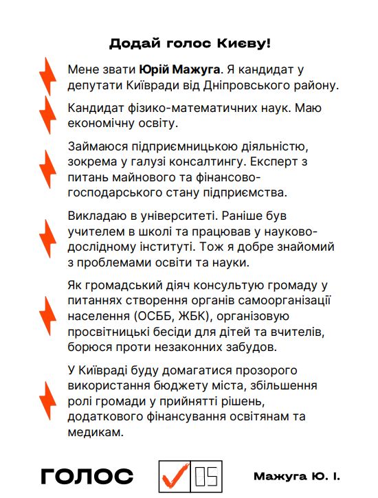 Щоб проголосувати персонально за Юрія Мажугу дотримуйтесь наступного порядку голосування:- Поставте позначку «+» навпроти партії «ГОЛОС» в бюлетені (№ 17).