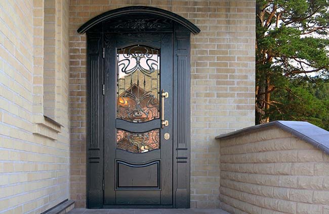 - Дерево. Двери из натурального дерева смотрятся дорого и украшают входную группу дома, однако эксперты не советуют делать свой выбор в пользу деревянных дверей, поскольку у них есть ряд существенных недостатков. Обычные входные двери из дерева хуже всего защитят ваш дом от взломов и пожаров. Кроме этого, дерево имеет свойство расширяться и сужаться от перепадов влажности и температуры, поэтому через время полотно может покоситься или могут образоваться щели между дверями и коробкой. Альтернативой цельным деревянным дверям могут стать металлические двери с накладками из натурального дерева.