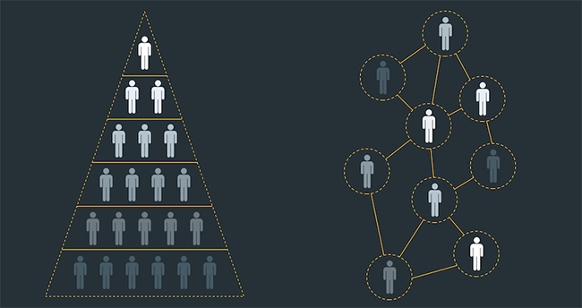 Может сложиться впечатление, что иерархия, централизация и жесткая подчиненность определяются незыблемыми фундаментальными законами природы, но это не так. Даже в животном мире, где отсутствует осознанная свобода выбора, бывает по-другому. На разных уровнях эволюции ученые наблюдают не только формирование иерархий, но и их смягчение и даже формирование неиерархических (горизонтальных) структур. Уже упоминавшийся биолог Конрад Лоренц, как пример неиерархической организации, приводит безлидерные стаи рыб. Первой в такой стае плывет случайная особь, которая случайным образом заменяется другой особью.