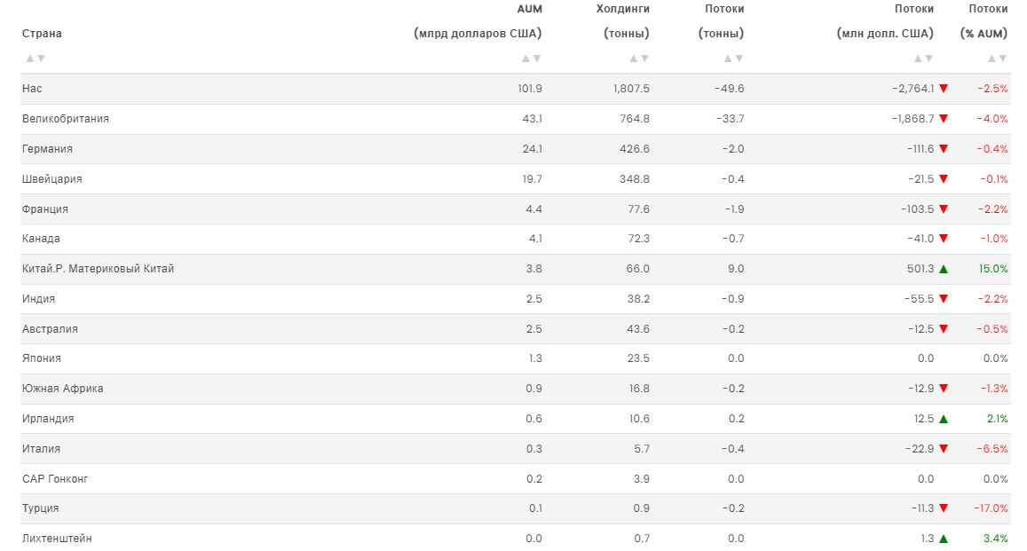 - В Европе iShares Physical Gold потеряла 33,5 трлн (-$1,9 млрд, 11%), а WisdomTree Physical Gold потеряла 3,0 трлн (US$167млн, 3%). Invesco Physical Gold был единственным фондом в Европе со значительным притоком, прибавив 4,2 трлн (US$235млн, 2%)