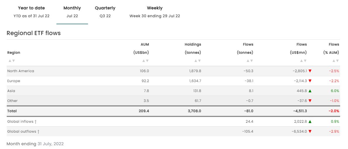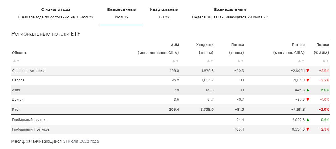 В целом, глобальный приток по сравнению с аналогичным периодом прошлого года составляет 153 тонны (10,3 млрд долларов США). Несмотря на отток в последние месяцы, приток 2022 года почти компенсировал отток 2021 года, подчеркнув сохраняющийся стратегический спрос на золото. Общий объем активов на конец июля составил 3 708 тонн (209 млрд долларов США), что на 5% больше, чем в прошлом году.