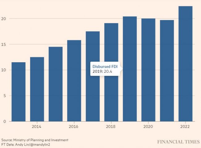 В 2022 году Вьетнам получил 22,4 млрд долларов от проектов с прямыми иностранными инвестициями (ПИИ), что на 13,5% больше, чем в предыдущем году. Хотя в первые пять месяцев года ПИИ несколько снизились по сравнению с аналогичным периодом прошлого года, инвесторы, аналитики и официальные лица отмечают, что интерес к ним остается высоким.